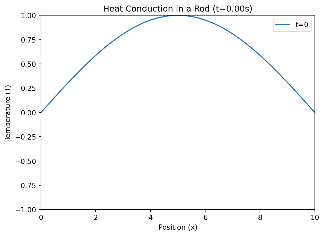 import numpy as npimport matplotlib.pyplot as pltfrom matplotlib.animation import FuncAnimation# ParametersL =10.0# Length of the rodT_max =2.0# Maximum timeNx =50# Number of spatial pointsNt =100# Number of time stepsalpha =0.01# Thermal diffusivity# Discretizationdx = L / (Nx -1)dt = T_max / Ntx = np.linspace(0, L, Nx)u = np.zeros((Nx, Nt +1))# Initial Conditionu[:, 0] = np.sin(np.pi * x / L)# Boundary Conditionsu[0, :] =0u[-1, :] =0for n inrange(0, Nt):for i inrange(1, Nx -1): u[i, n +1] = u[i, n] + alpha * dt / dx**2* (u[i +1, n] -2* u[i, n] + u[i -1, n])fig, ax = plt.subplots()line, = ax.plot(x, u[:, 0], label='t=0')ax.set_xlim(0, L)ax.set_ylim(-1, 1)ax.set_xlabel('Position (x)')ax.set_ylabel('Temperature (T)')ax.set_title('Heat Conduction in a Rod')ax.legend()def update(n): line.set_ydata(u[:, n]) ax.set_title(f'Heat Conduction in a Rod (t={n * dt:.2f}s)')return line,ani = FuncAnimation(fig, update, frames=range(0, Nt, int(Nt /10)), blit=True)plt.show()