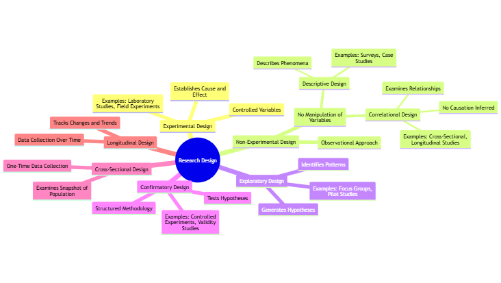 A detailed mindmap of different types of research designs used in scientific research is given below.