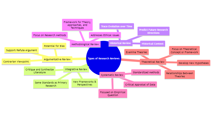 A mindmap of types of Literature reviws with charateristics is shown in the following figure and the explanation follows.
