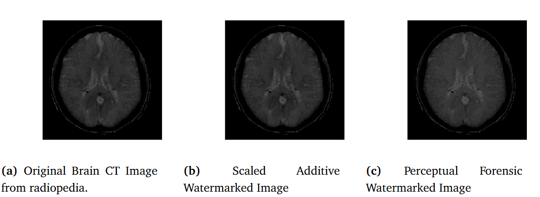 The effect of watermarking on the Brain CT image using different image forensic approaches is shown in Fig. 14. The scaled addition method achieved a Peak Signal-to-Noise Ratio (PSNR) of 33.93, balancing visibility and quality. Meanwhile, the perceptual forensic approach, designed to better manage watermark strength relative to image details, attained a PSNR of 102.87, maintaining high image fidelity. These results indicate that SVD-based watermarking techniques can be effective for medical imaging applications, where preserving diagnostic quality while protecting image authenticity is critical. This adaptive method offers a balanced approach to ensure data protection without compromising readability and detail in medical images.