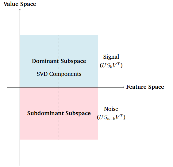 The Singular Value Decomposition (SVD) of the original data matrix \(X\) enables its decomposition into two orthogonal subspaces: the dominant subspace, represented by the components \(US_kV^T\), which corresponds to the signal information, and the subdominant subspace, represented by \(US_{n-k}V^T\), which captures the noise components. This dual representation provides a clear delineation of the image data into signal and noise, significantly enhancing our ability to analyze and process the data effectively. This formalism can be represented as in Figure Fig. 4.