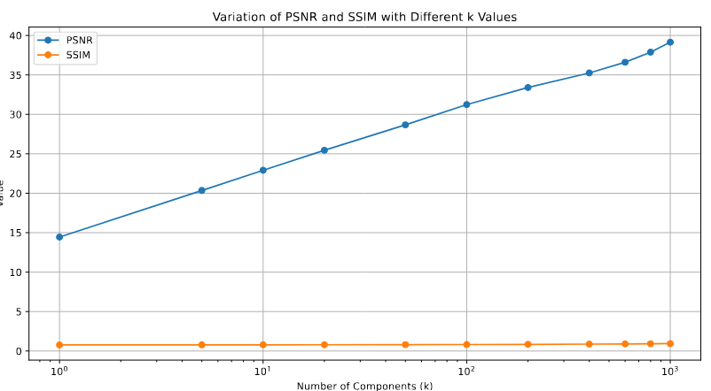 The comparison of various image compression methods, as presented in Table 1, highlights the promising performance of Singular Value Decomposition (SVD) image compression. The SVD method achieved a Mean Squared Error (MSE) of 36.1802, a Peak Signal-to-Noise Ratio (PSNR) of 32.5461 dB, and a Structural Similarity Index Measure (SSIM) of 0.8247. In terms of image quality, a PSNR value above 30 dB is generally considered acceptable for high-quality image reconstruction, and the SVD method meets this criterion. Similarly, the SSIM score of 0.8247 indicates a relatively high level of structural similarity, as values closer to 1.0 are preferred for maintaining perceptual quality. These results suggest that SVD is a promising approach for image compression, effectively balancing compression efficiency with visual quality, particularly suitable for applications that require efficient storage and satisfactory image fidelity.